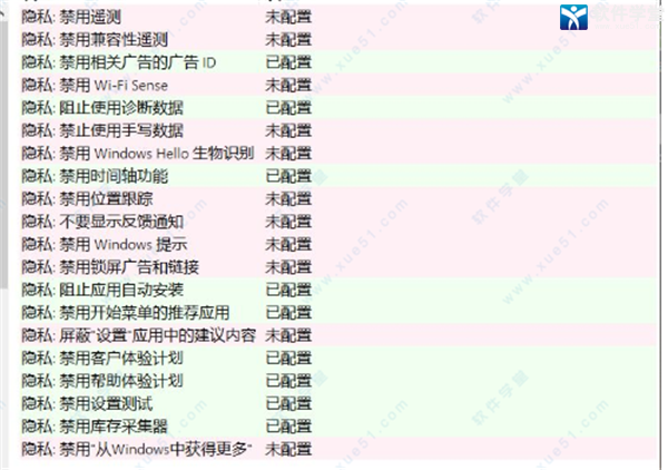 2、活动设置被标记为“已配置”状态,表示您的隐私受到保护。 不活动的被声明为“未配置”。 所有可用设置均可启用和禁用。