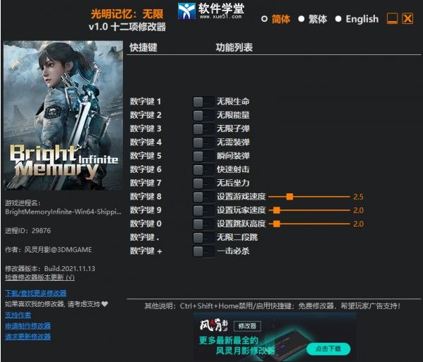 光明记忆无限修改器是一款为同名软件精心打造的游戏辅助工具。这款软件能够帮助玩家在游戏中更好的进行战斗,让玩家能够瞬间完成换弹或者直接无需换弹,还能够进行快速的射击。这款游戏是一款以未来世界为背景的科幻射击类游戏,该类型游戏对于玩家的射击的精准度要求较高,玩家们在游戏中与敌人战斗的过程之中是否能够有效的杀伤敌人主要看玩家射击精准度。而射击精准度的偏差来源于游戏中枪械的后坐力,很多新手玩家对于游戏中枪械弹道以及后坐力并不了解导致射击精准度不够。而这款软件能够帮助玩家直接取消游戏中的后坐力,能够有效的提高玩家的射击精准度。并且软件还有这其他更多的功能,等待着玩家的使用。小编今天带来的是