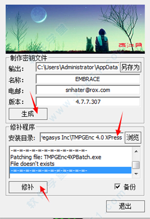 6、打开文件夹内的注册机,找到安装目录(这里以C:\Program Files\Pegasys Inc\TMPGEnc 4.0 XPress为例)把它复制到安装目录文件夹内,双击注册机,然后点击修补按钮,最后点击生成按钮