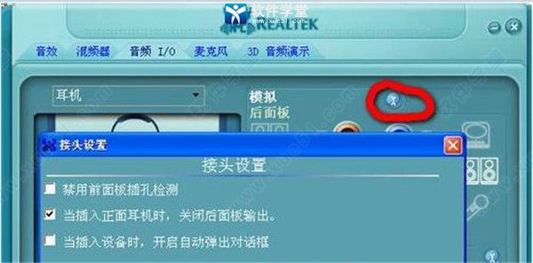 4、点击“音频I/O”的小工具按钮,弹出“接头设置”选择,第一个选择是“禁用前面板插孔检测”,这个选项不要勾。第二个是“当插入正面耳机时,关闭后面板输出”,这个是选择勾上的,因为一般情况下是后面板插音响,前面板插耳机。第三个是“当插入设备时,开启自动弹出对话框”,这个建议不勾。