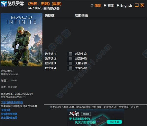 光环无限修改器3dm版,它是由风灵月影大神为该游戏制作的一款游戏修改器,可修改无限子弹、无需装弹、超高生命、超高护盾这四项强大的修改功能,帮助玩家们更好的体验游戏乐趣,有需要的小伙伴们欢迎前来下载。