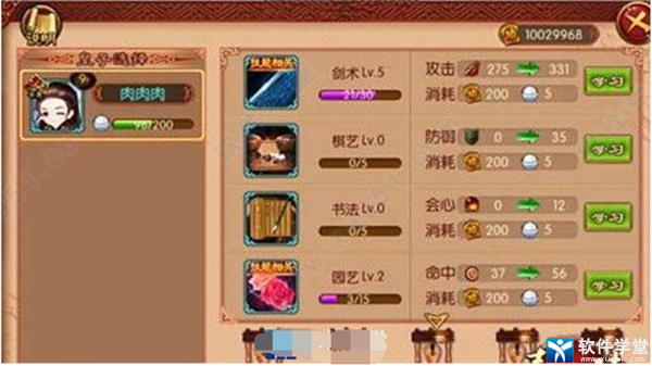 在皇子进入成年形态,皇子就定型了,这就是永远长不大的形态啊,永远保持萌萌哒。成年后的皇子,就可以进行除了幼儿时期的亲子互动外的皇子培养,皇子培养又分为资质培养、属性培养和技能培养。通过亲子的互动,课程的学习和游历等活动提升资质和属性。而技能的学习由皇子的个性、阅历值和技能书所决定,学习技能将消耗阅历值和技能书。另外,除了个性决定皇子技能库外,皇子技能的获取是随机的。装备上技能之后的皇子便可以为父母战斗了,上阵父子兵果然最后又回到宫斗了!