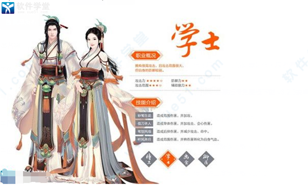职业技能:借刀杀人 :造成单体伤害,并增加自身供给与暴击伤害;笔惊风雨:对敌方后排单位造成伤害,并降低目标的命中;吟风弄月:造成范围伤害,并偷取一定生命值;妙笔生花:造成大范围伤害,并增加自身攻击。