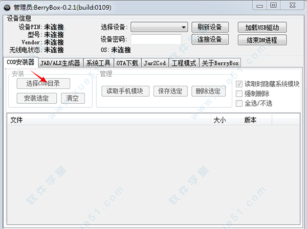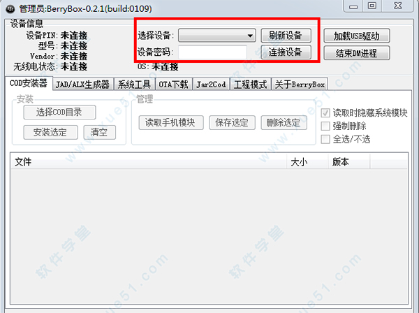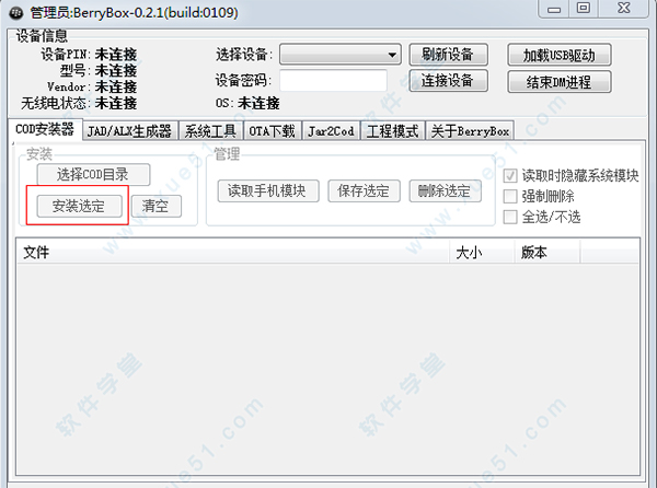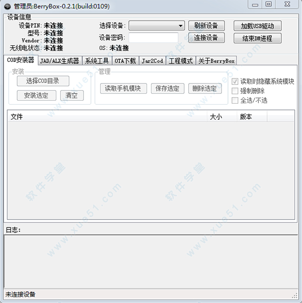BerryBox是一个方便好用的黑莓手机管理工具,也可以说是黑莓设备辅助程序,通过连接手机设备来维护手机上的程序,在使用过程中能用到一系列的辅助功能,比如:JAD/ALX生成、OTA下载、Jar转换Cod等。这款黑莓手机管理工具可以替代桌面管理部分功能,比如安装、删除软件,并且支持直接cod文件安装,并且装软件不用重启,比桌面管理其方便多了,并且提供了实用功能,比如手机截图,格式化手机等。