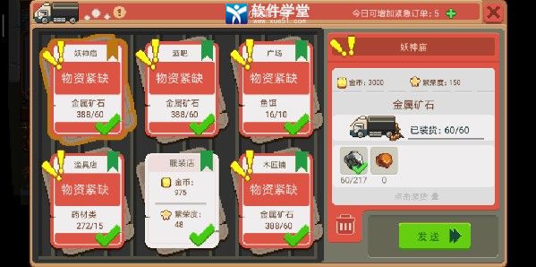 普通订单的货物是固定的,收集齐物品发送订单后,就完成订单获得固定的金币和繁荣度。