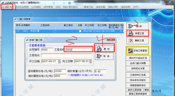4、请按照以下截图操作,因为此类软件第一步都是新建工程,顺序为门窗工程-新增工程-工程名称河东原办公楼-工程地点贵阳市南明区,最后点击“增加”按钮,