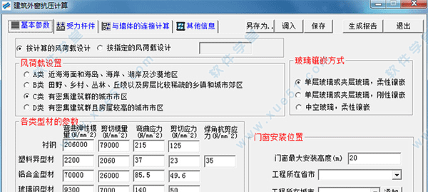 7、风压校核:采用最新标准,可适用于各种类型的门窗、任意复杂分格形式的窗型,对组合部位的型材和钢衬进行分别校核;报告内容有受力杆件的抗弯强度、抗剪强度、挠度计算;玻璃应力和最大许用面积计算;连接件的抗剪强度和承压能力计算;另外,内置自主研发的截面参数计算软件,可对任意型材和钢衬的惯性矩、抵抗矩、面积矩、截面积等参数计算工具;