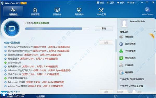 如何使用Wise Care 365加快PC速度?通过PC Checkup快速清理系统1、单击窗口中心的绿色大按钮“ 检查”后,开始扫描系统,然后显示结果,包括隐私风险,安全项目问题,无用文件,无效的注册表项以及与隐私相关的问题。