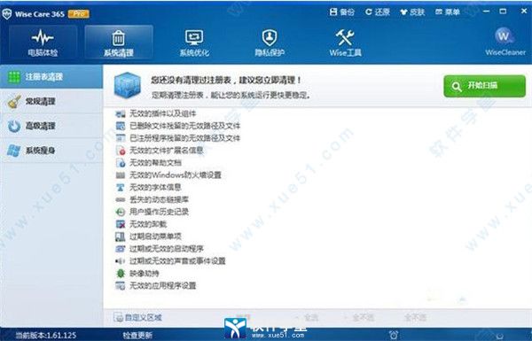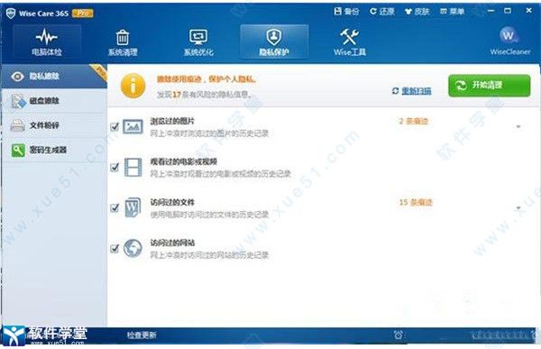 Wise Care 365 Pro能够实现清册表清理,常规清理,计算机痕迹清理、高级清理和系统瘦身。常规清理是非常傻瓜化的,而高级清理的高级设置中,能够让你添加更多不同种类的系统垃圾文件后缀名,从而让清理功能更加强劲。系统瘦身则是可以删除补丁文件、示例音乐和自带壁纸;