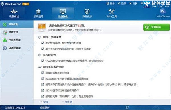 Wise Care 365 Pro是一款功能强大的系统优化软件。在我们的日常工作生活中,已经越来越离不开电脑的存在,我们的很多工作都需要通过电脑来完成,然而相信大家都感到到,随着我们电脑使用时间越长,电脑的系统就会开始变得缓慢、卡顿,即使是我们的电脑系统中并没有下载很多的软件,而且经常清理垃圾,仍然也不会有很大的改变。其实,这是因为我们经常会通过电脑来浏览各大网站信息,下载各种文档文件而慢慢累积了很多注册表,浏览信息等缓存垃圾所导致的。虽然我们通过电脑自带的清理软件可以清理掉一些垃圾文件,但它们只能进行一些简单的清理,很多隐藏的较深的垃圾文件并没有并清理掉,随着长时间的日积月累,自然就会拖慢我们的电脑进程了。而今天小编带来的这款软件则市面上的其他清理软件不同,它能够帮助用户们进行深层度的清理与优化,能够更好的释放内存空间。而且软件体积小巧,只有十几兆大小,并不会占用我们太多的内存空间。同时,软件还有其他更多清理与优化功能,包括系统调优、系统监控和帮助、PC检查与系统清理程序等等,是我们用来清理注册表和磁盘垃圾文件,优化系统与提高Windows系统运行速度的最好选择。而且该软件还能够很好的保护我们的个人隐私记录,提高电脑使用安全。一旦我们的电脑系统中,有某些应用程序试图在未经您许可的情况下进行更改,它就会立即采取行动,软件内置的保护程序将会识别并停止任何试图秘密更改Windows注册表的进程。总的来说,该软件是一款非常不错的电脑系统清理优化软件。