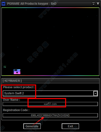 3、运行注册机,选择System Swift 2,输入名称,名称要超过6个字符且不能含有中文字符,然后点击generate生成序列号
