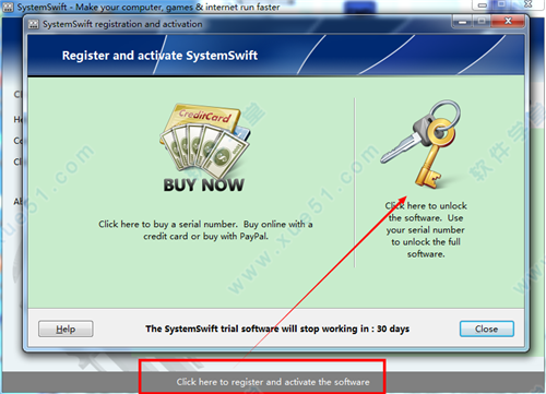 4、进入软件,点击页面最下方的“click here to register and activate the software”,在点击右边的钥匙图标进入注册页面