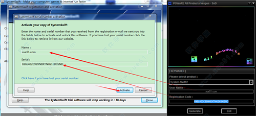 5、断掉网络,将注册机上的名称和序列号复制到软件注册页面,点击“activate”