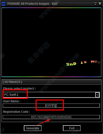 3、运行注册机,选择PC Swift 2,输入名称,名称要超过6个字符且不能包含中文字符,然后点击generate生成序列号