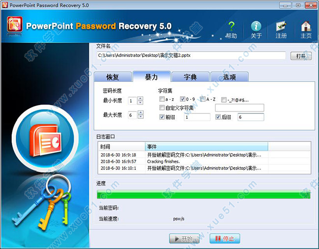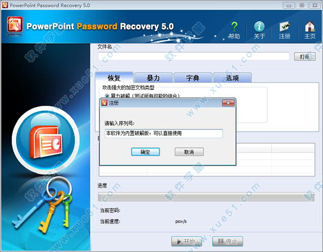 PowerPoint Password Unlocker是一款可以破解PPT密码或者恢复密码的工具,软件支持三种方式的密码破解暴力破解、使用掩码破解,字典破解,程序会自动保存密码的搜索状态,并停止或崩溃后可以恢复,这里提供的中文绿色免注册版的,喜欢的朋友赶紧下载吧!
