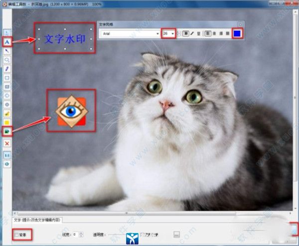3、选择左边的“文字”工具,输入文字内容,在旁边还可以选择字体大小和颜色,记住下面不要勾选“背景”,