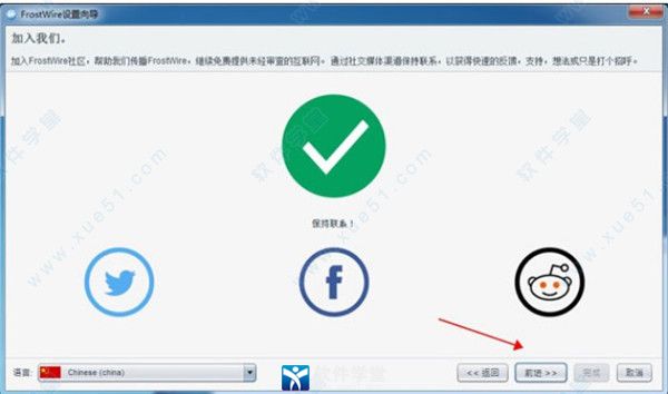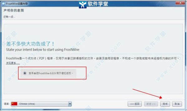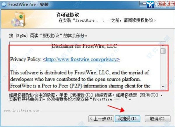 5、在以下界面中,我们勾选“不会将FrostWire用于侵犯版权”,然后即可进入软件主界面。