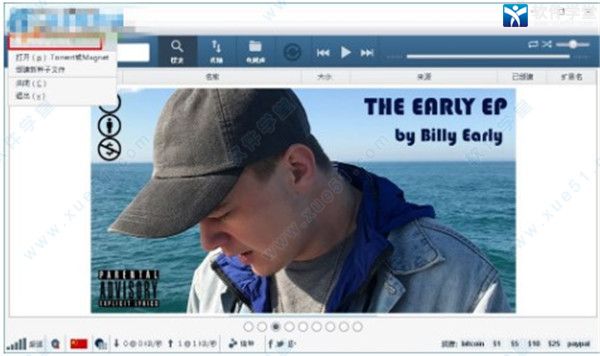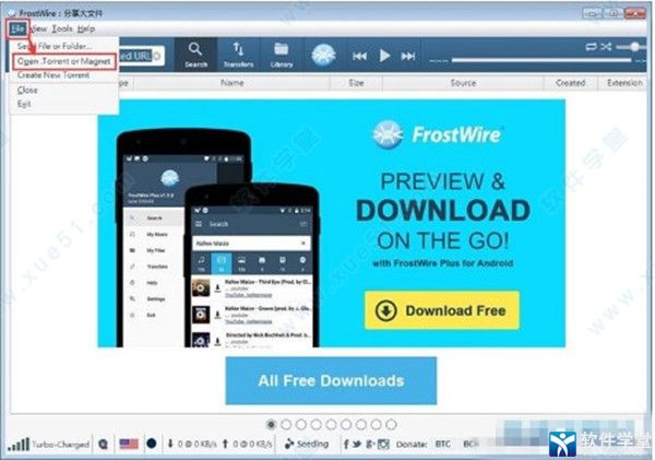 1、这里给大家演示一下怎么使用FrostWire进行BT下载。我们点击软件左上角的File,在展开菜单汇总点击选择Open Torrent or Magnet,打开BT种子打开功能窗口。