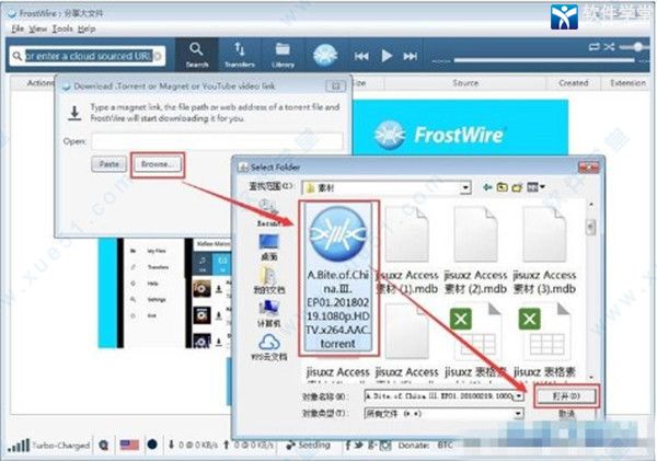 2、然后在BT种子打开窗口中,点击Browse,打开文件选择窗口。并根据BT文件存放的路径找到想要打开的BT种子文件,点击选中文件后打开。