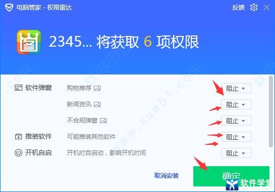 2、进入软件安装界面,将上面的权限全部禁止。