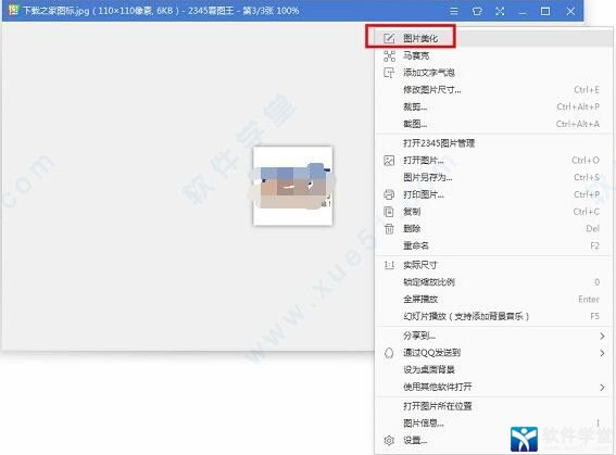 方法二:在看图窗口,单击鼠标右键,选择最上方的“图片美化”选项。