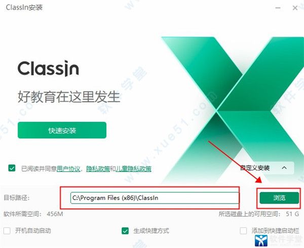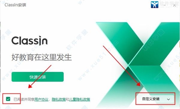 3、然后勾选同意用户协议,接着点击自定义安装,可选择软件安装位置。
