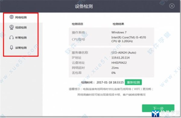 对于第一次安装使用该软件的用户,我们在登录教室前,软件会帮助你对你的网络环境、以及音视频设备进行检测,以确保您能正常上课。