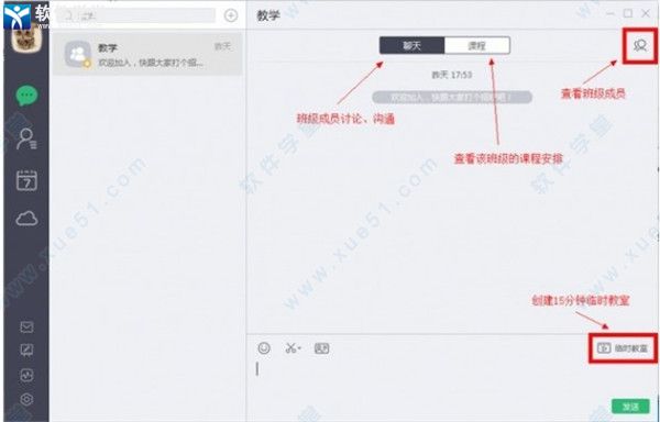 点击进入班级后,默认显示【聊天】界面,在班级中可查看全部成员和课程安排,每位成员都可创建15分钟的1v1临时教室。