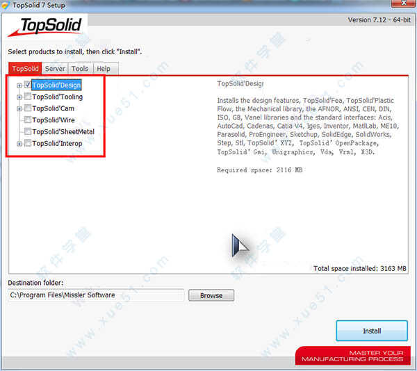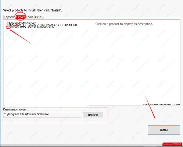 4、进入安装向导后,功能组件默认即可,选择安装位置,这里以默认路径为例,默认路径为“C:Program Files Missler software”,选择完成后先不要点击“Install”,点击Server,将“Sentinel RMS License manager 8.6”勾上,这个很重要,最后点击“install”