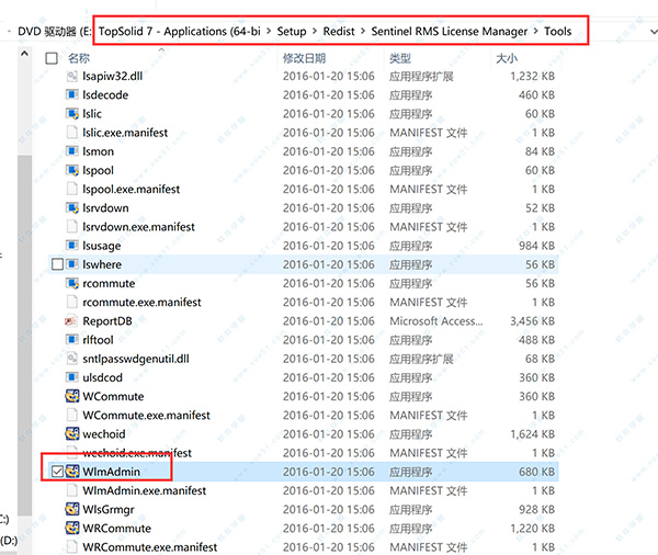 2、打开安装镜像磁盘E盘,找到E:SetupRedistSentinel RMS License ManagerTools文件夹,运行“WlmAdmin.exe”