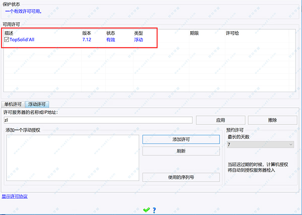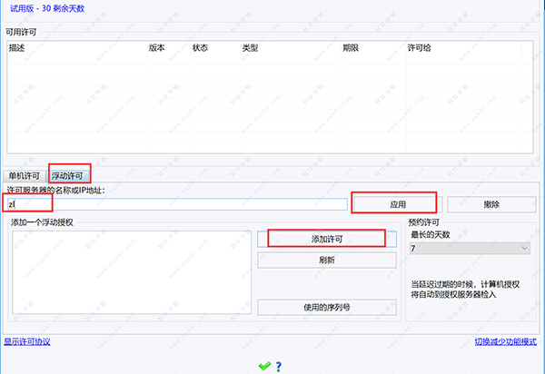 7、选择浮动许可,输入刚才我们注册的服务器名称zl,点击应用,然后选择许可点击添加