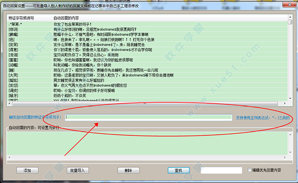 如果你要手动修改自动回复内容的话,请确保“特征字符”(也就是会触发自动回复的特征词语)和自动回复的内容在一行,中间用tab键分开(空格键也可以,但不容易对齐,建议还是用tab键)。