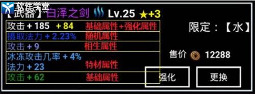 强化属性:属性颜色为黄色,该属性由强化等级决定,是提升实力很重要的部分。武器强化攻击、防具强化防御、项链强化生命、戒指强化法力,披风内甲强化各系特有属性,强化数值计算该装备全部攻击、防御、生命或法力。