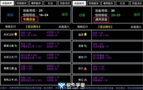 专属装备:游戏分五行,所以装备也分五行,在特定阶段,玩家仅可使用本系专属装备,这类装备在右上角均会标记【限定】的字样。目前专属装备等级分别为25、45、55、70、85……