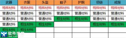 方式二还有一种情况需要考虑,即上图右一,相生材料跟普通材料不是同类材料,拿上图武器来讲,特殊材料跟相生材料属于同类,那么特殊材料也算入主材料,这时有4个主材,我们可以再放2个相生材料;若特殊材料跟普通材料不属于同类,那么特殊材料不算入主材,那么我们需要另外添加四个主材,此时仅可放一个相生材料。
