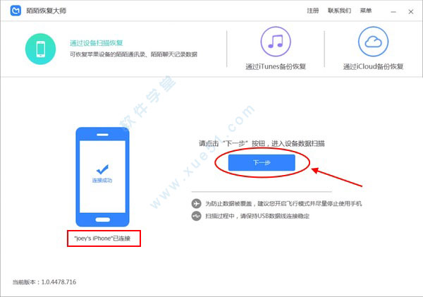 第二步、安装完成后,把手机连接到电脑,如果手机是第一次连接电脑,手机上会跳出【是否信任此电脑】窗口,点击【信任】即可。当陌陌恢复大师显示“iPhone已连接”,说明手机已经正确连接到电脑,点击【点击下一步】即可。