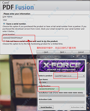 4、这里选择“i have a serial number”,再打开注册机文件“xfcwp9.exe”,选择“Corel PDF Fusion v1.11”,再点击右下角serial number得到序列号,再将序列号复制到软件框中;
