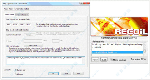 4、软件安装完成后,打开软件,菜单栏”help>active deep exploration“,输入激活码0000-0000-0000-0000,选择邮件激活,将”LICENSE righthemi rh_de_cad 6.0 permanent uncounted hostid=ANY customer=RCL _ck=a81efca790 sig="60PG4580HCEHSE220JPKGCBCU78PD0GYR3T5PYAG08A0MTY0500W6CUCTMG80R9Y7U9C0NQCBYA0"“运行许可复制到下面的输入框,运行破解文件patch.exe,点击”patch”,出现“PATCHINIG DOWN”提示破解完成