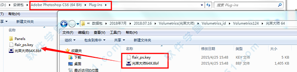 2、将8bf文件和flAIR_ps.key同时复制到photoshop下的 滤镜目录Plug-ins中。一般默认的 Photoshop 安装目录为C:\Program Files\Adobe Photoshop CC\Plug-ins\