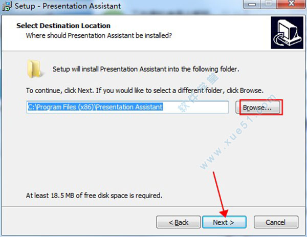 3、根据自己的喜欢选择安装路径,默认路径为C:\Program Files (x86)\Presentation Assistant,可点击“browse”更换安装路径,需注意该程序全部安装需要18.5M的空间,请确保所选择的硬盘满足其安装要求然后点击“next”