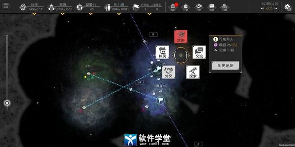 3、探索中不要建交,如果发现大量星球,宜居行星的星系,立刻舰队出击,只要对方没有建立探测装置,不被征兵的的情况下基本上都可以偷家成功。如果你打击范围广一些可能开局就会消灭一到两个文明(靠舰队)