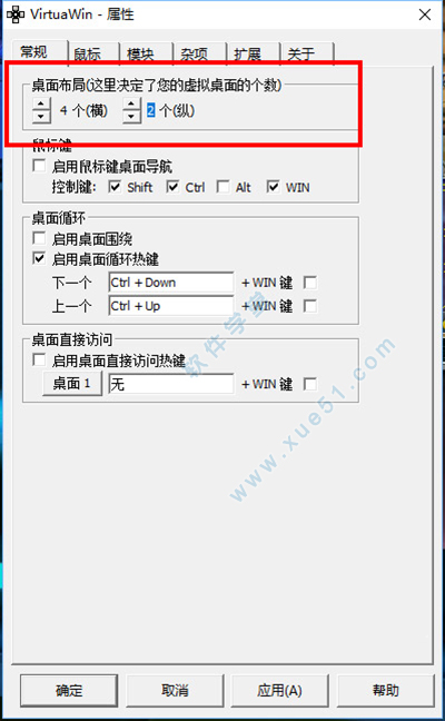 2、点击设置按钮,可以进入VirtuaWin的设置界面,支持最多支持3*3个虚拟桌面