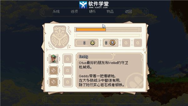 大多数作品都不相同,它采用了各种非人类的角色来进行打造,虽然每个角色都很小,但是你能够清楚的感受到它们情绪的变化,一举一动之间都能够展现它们的心情。而且本作的战斗玩法也是独一无二的,主角的各种作战能力完全是靠其它小伙伴来完成的,比如最初的Geddy能够提供远程攻击能力,搭配之后就可以享受到射击的快感,后续还有更多的能力可以进行解锁,十分有趣。在此小编就给大家带来了