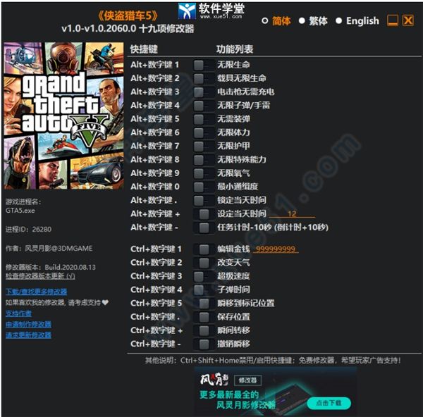 侠盗猎车手5修改器3dm版是由风灵月影制作的一个游戏修改器,它可修改无限生命、无限子弹/手雷、编辑金钱、改变天气、瞬间转移等多达十九项游戏功能,感兴趣的朋友欢迎前来本站下载。
