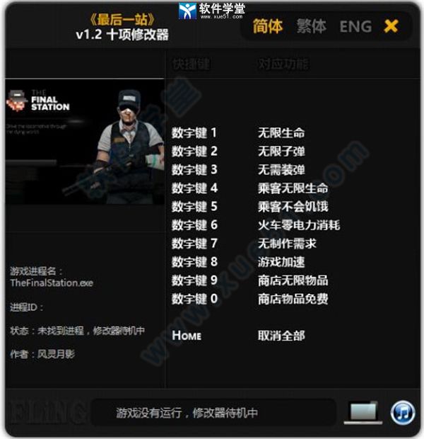 最后一站修改器风灵月影版是由风灵月影大神制作的,它可支持修改十项游戏功能,包括无限生命、无限子弹、火车零电力消耗等等,感兴趣的朋友欢迎前来下载。
