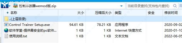 1、在软件学堂下载修改器压缩包,并解压得到以下文件。