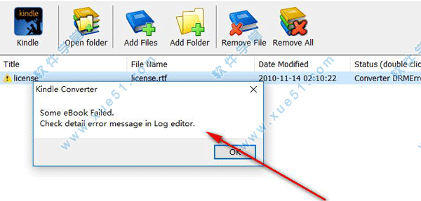 5、当转换失败的时候,提示 Kindle Converte在日志编辑器中检查细节错误信息。