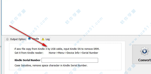 7、如果azw文件从Kindle 3的USB,可以在 home->menu->Device info->Serial Number地址设置输出参数