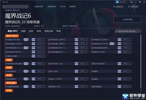 魔界战记6二十二项一修大师版辅助工具便能够让玩家有着更加舒适的游戏体验。游戏的前期还可以推推剧情,做做任务什么的,后期就是单纯的刷数值游戏,大家可以使用小编的这款修改器极大的较少中间刷级的过程,打开便可以快速增加角色的各项属性,其中也包括了玛纳、金钱等资源,让大家在升级的路上不在无聊,感兴趣的朋友可以来本站获取该修改器的应用资源。