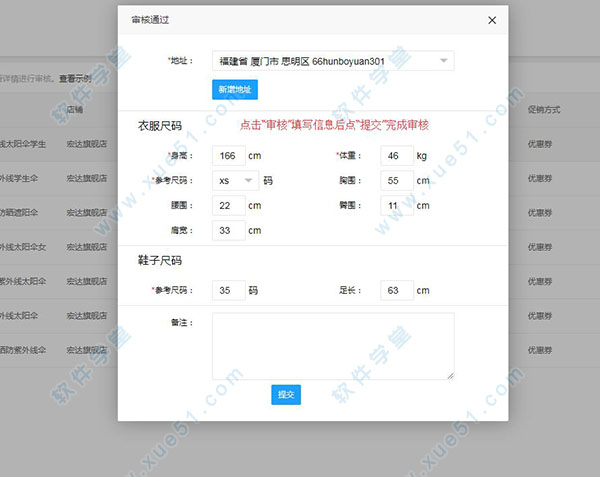 5、点击“审核”填写地址等信息后点“提交”完成审核,点击审核后会立马返回到商家端,商家即知道您的审核状态。